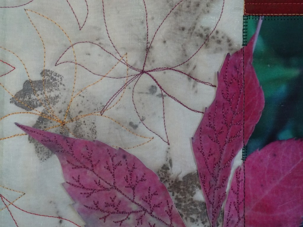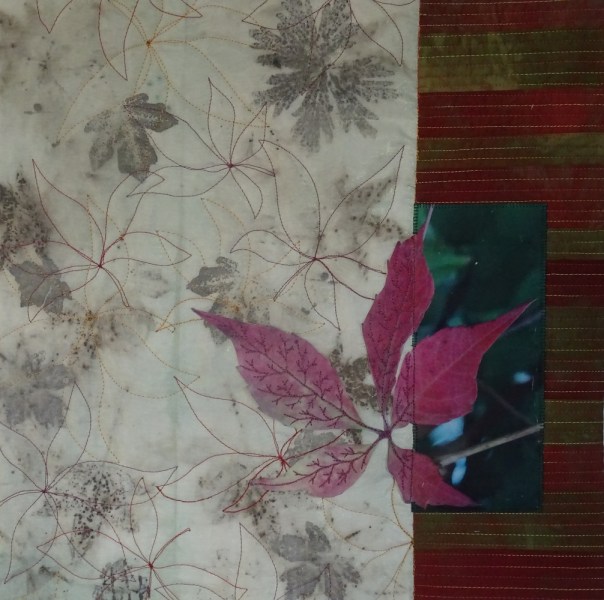 It is a very effective composition and the use of the ecoprint fabric is perfect. I like the contrast between the real leaf and the ecoprinted ones.