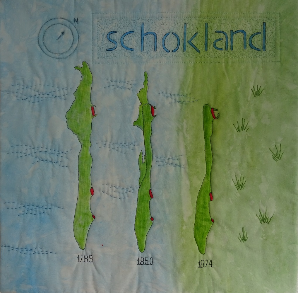 My first piece shows how the island became smaller and smaller. Almost 50% disappeared in the sea between 1789 and 1874. After that it stayed more or less the same, because a long dike was built at the west coast to protect the island.
