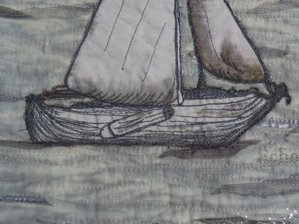 The boat is threadpainted on a white piece of fabric and appliqued later.
