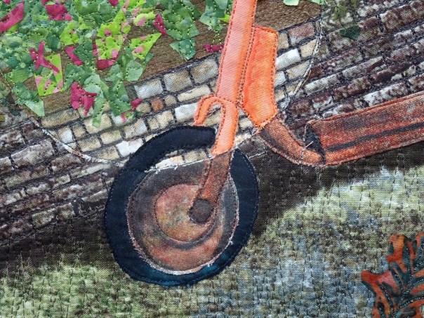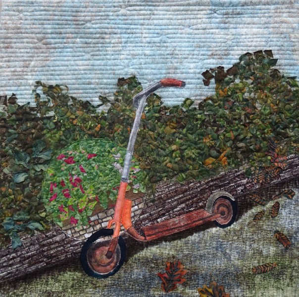 A few months ago I took a picture of this children’s scooter. The scooter was rusted in a garden. It was autumn. For this quilt I wanted to capture the autumn atmosphere. I used commercial fabric. For the hedge, various batik fabrics have been cut into pieces. The scooter is made extra rusty with intense pencils. The image continues in the circle, but with bright colours.