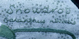 What a nice idea to use your own garden as a theme for this letter series. I love the confetti background and am looking forward to the change of seasons that will show into your next quilts backgrounds. Lovely executed snowdrops and name embroidery.