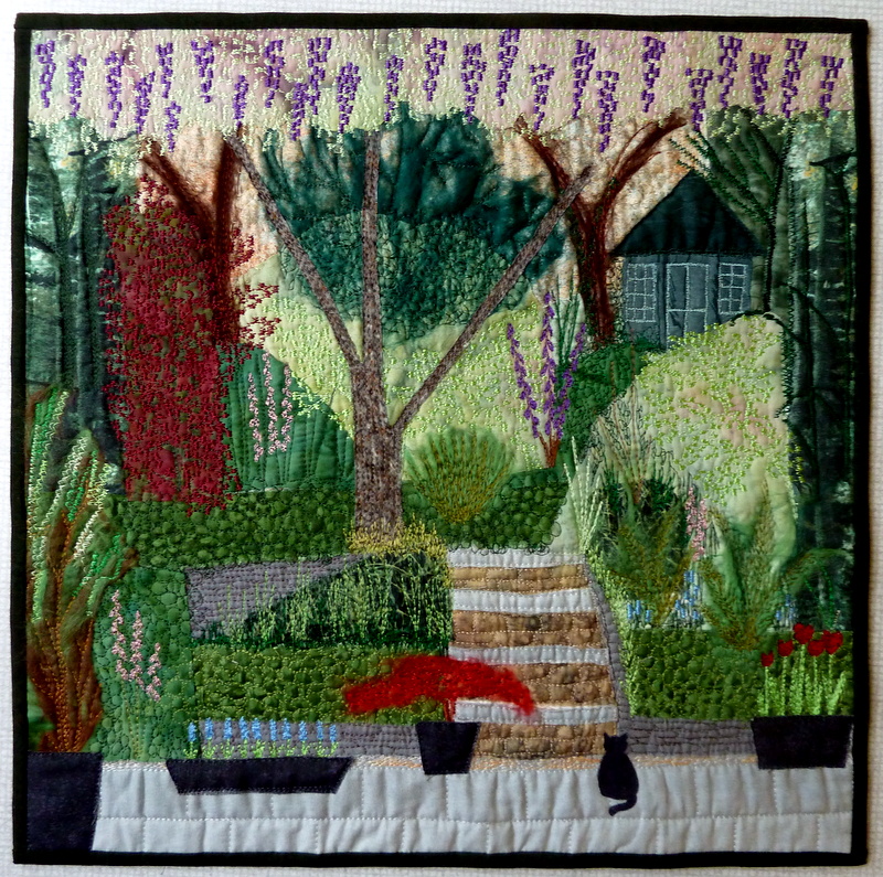 This is based on the view of my own garden from the kitchen window. There are lots of trees and other greenery with flowers that at present are all in shades of blue, pink and purple. My little summerhouse sits at the end of the garden. I made a collage with many fabric scraps and some wool strands and then I added lots of machine embroidery.