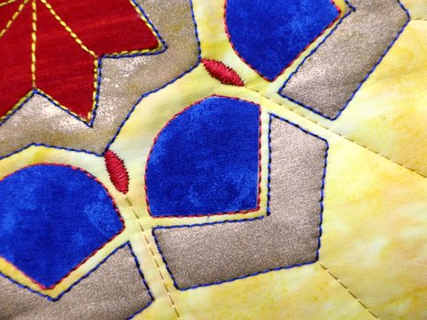 I used an Old Gold Markal paint stick with three different stencils to produce the backbone of the design. I added appliqué then machine embroidery for detail and quilting for depth. The temple itself is a symmetrical structure and the gardens around it also have a symmetrical layout and this is reflected in the sections of my design.