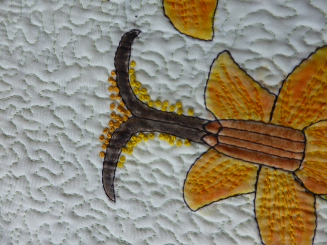The quilt is made entirely from cotton. The large flower section was appliqued then I drew the florets and coloured them with Inktense pencils. I added detail with hand and machine embroidery.