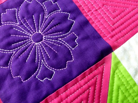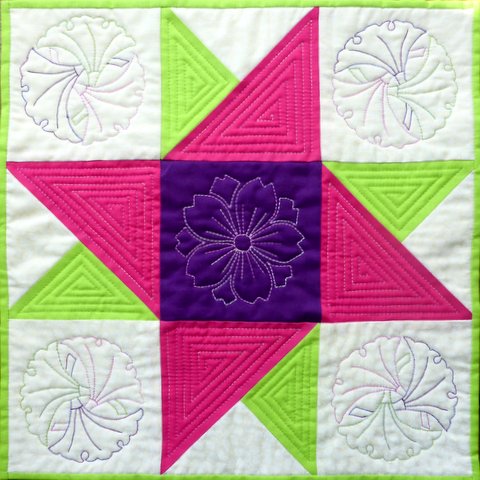 For this quilt I have used a traditional Western-style pieced star block as the background but in bright,  Indian colours. I quilted the triangular parts of the star with straight lines then I stitched Japanese kamon designs in the open squares. All fabrics and threads are cotton.
