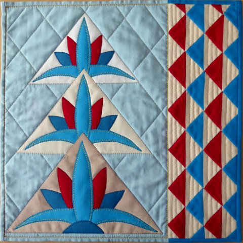 In this quilt I have brought together these two lasting memories – the imposing majesty and mathematical precision of the pyramids with the quiet beauty of the blue/green Nile. The decorative patterns of lotus and triangles can be seen on many ancient buildings in Egypt – the temples at Karnak and Abu Simbel in particular.
