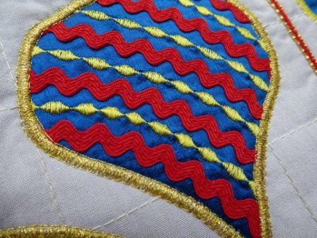 I have kept the 1/3 and 2/3 division as in numbers 1 and 2 in my series. This time the 1/3 section is at the bottom and is red for the “spilled blood” that the church stands on and also for the red that we all associate with Russia. The upper 2/3 is grey with regular lines of stitching to represent the many large solid buildings all around the city. I have used silk fabrics to create the five onion domes and the conical tower. I have added a variety of decoration to them and finished all edges with gold metallic thread satin stitch.