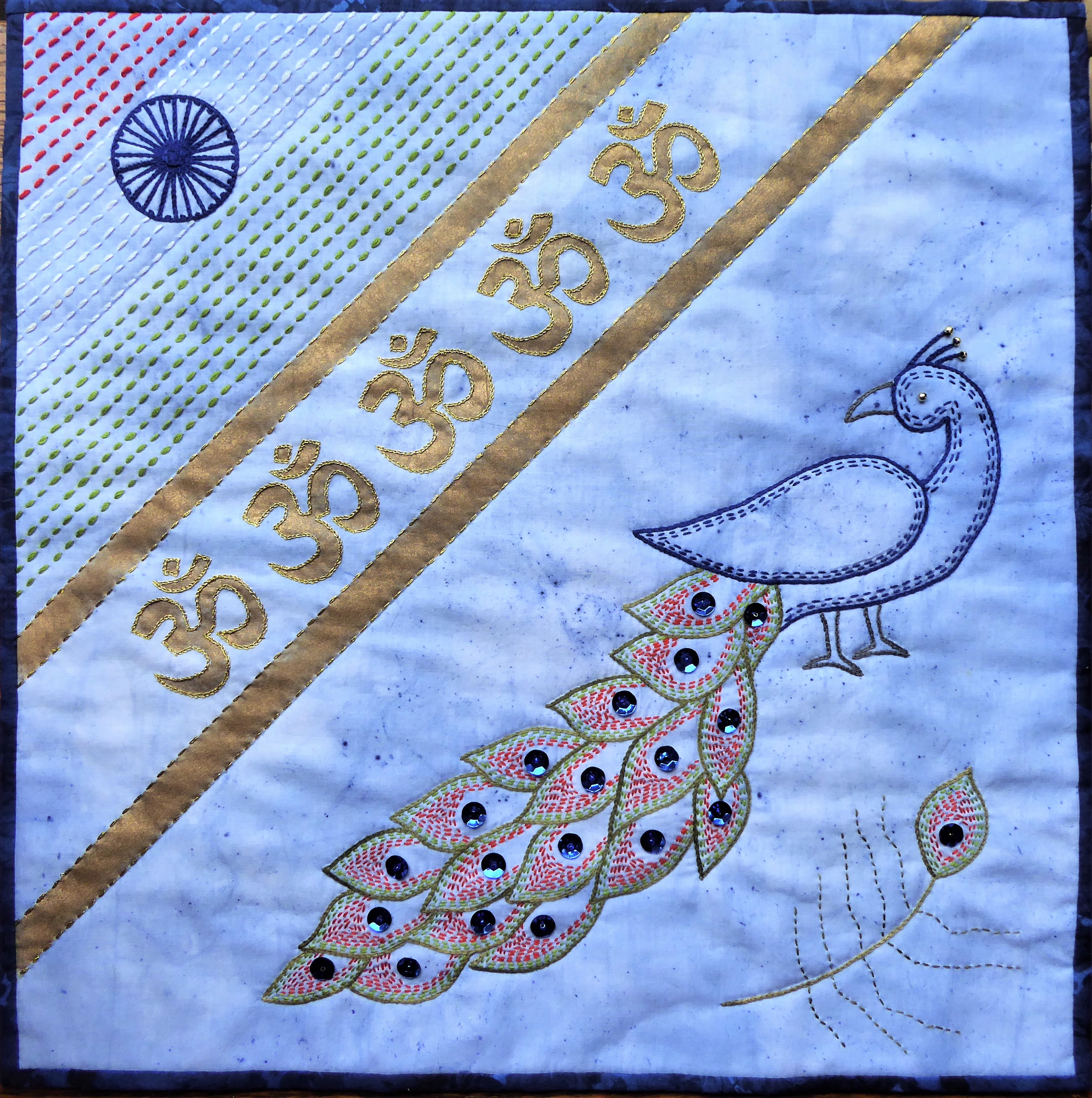 My design for this first piece takes the Indian flag as one main element and as the source of the orange, green and blue colour scheme for the stitching. I have also included the symbol for Om (or Aum) and the glorious peacock as particularly important motifs in Indian life.