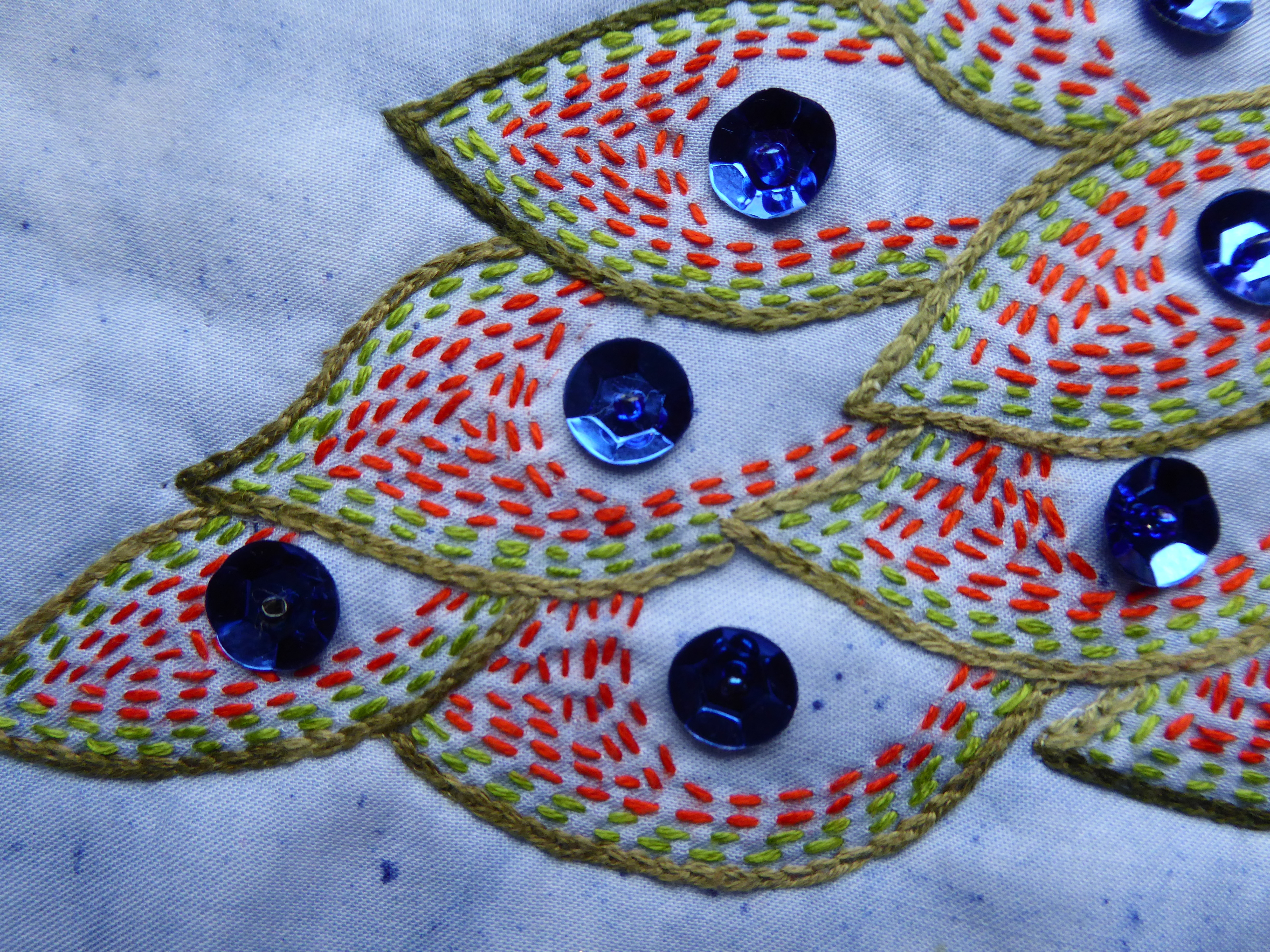 Well worked and creative design using the elements of the flag and the iconic peacock. Your hand stitching is beautiful and so precise. I love the way that you have dyed your background fabric as a reminder to the indigo dying you saw on your travels. Looking forward to the rest of your series