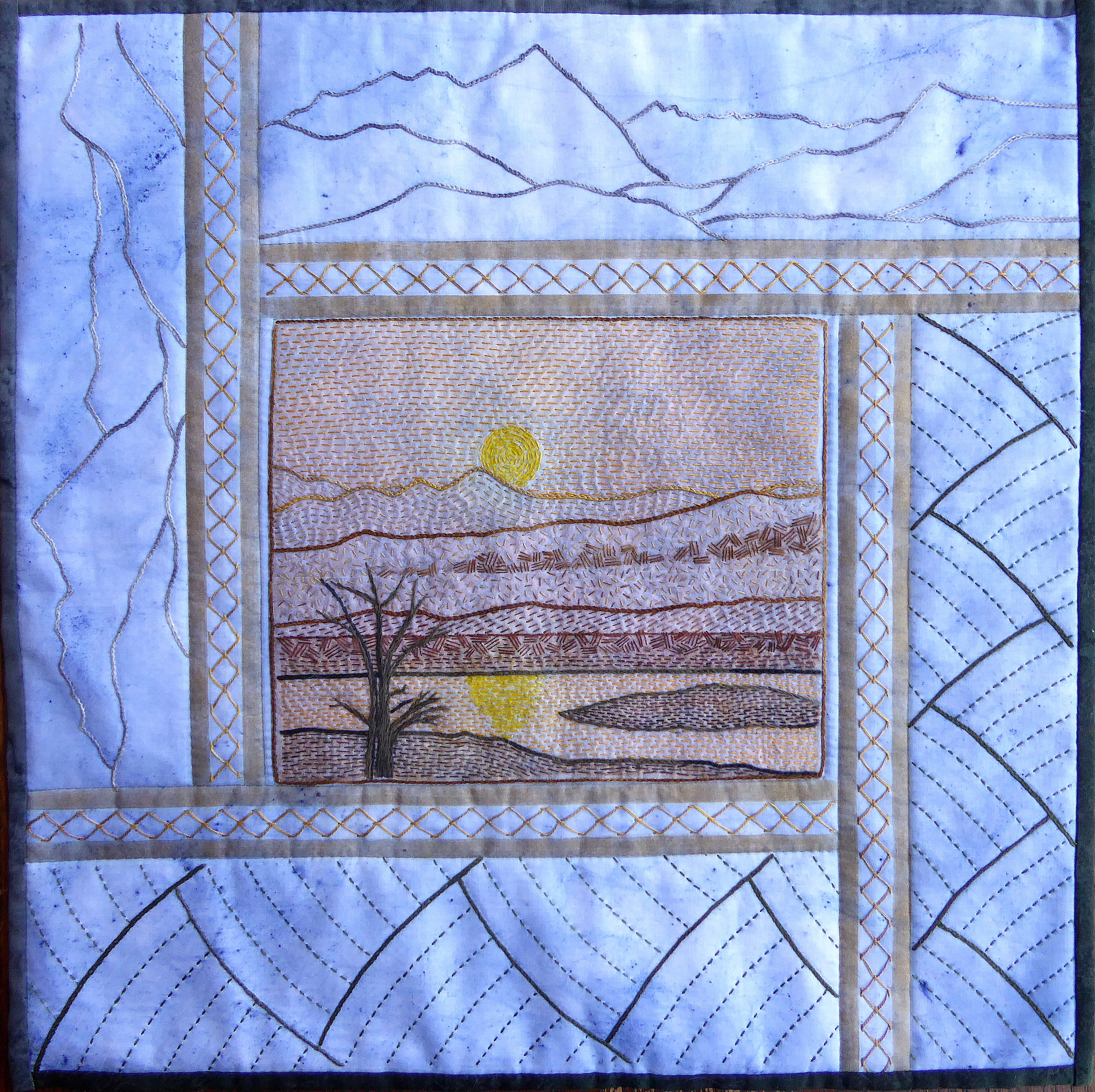 India is a vast country and so has a huge variety of landscapes including sandy deserts, lush forests, farmland and snowy mountains. For this quilt I chose three very different places to represent this variety. First the peaks of Kanchenjunga which is on the India/Nepal border and is the third highest mountain in the Himalayas. Second, tea gardens on the hillsides in Darjeeling and finally sunrise over a small lake in the desert of Gujarat.