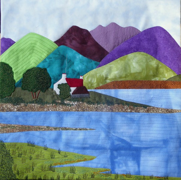 I chose David Hockney as my artist for 3 reasons – he’s English, he’s still alive and he paints colourful landscapes. For the topics for the 6 quilts in this year’s series I decided to concentrate on one of my family’s favourite areas – Applecross – where we have a short holiday every year. I have many photographs of this area and I will select 6 different landscape views to recreate in fabric. The main challenge for me will be working with the bright colours that Mr Hockney uses which are rarely in my palette. I will use piecing, applique and free motion machine embroidery to create the quilts.