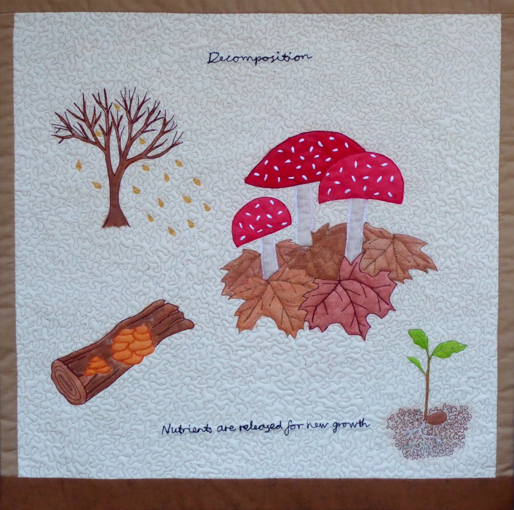 Many micro-organisms are involved in the process of decomposition. This process is important in removing the bodies of dead plants and animals and in releasing chemicals from those bodies to become nutrients for new growth. My final quilt in this series illustrates the fungus Amanita muscaria as it decomposes dead leaves – using some of the chemicals from the leaves to enable its own growth and releasing the rest into its surroundings. I have included a bracket fungus doing the same job as it grows on a dead tree trunk.
