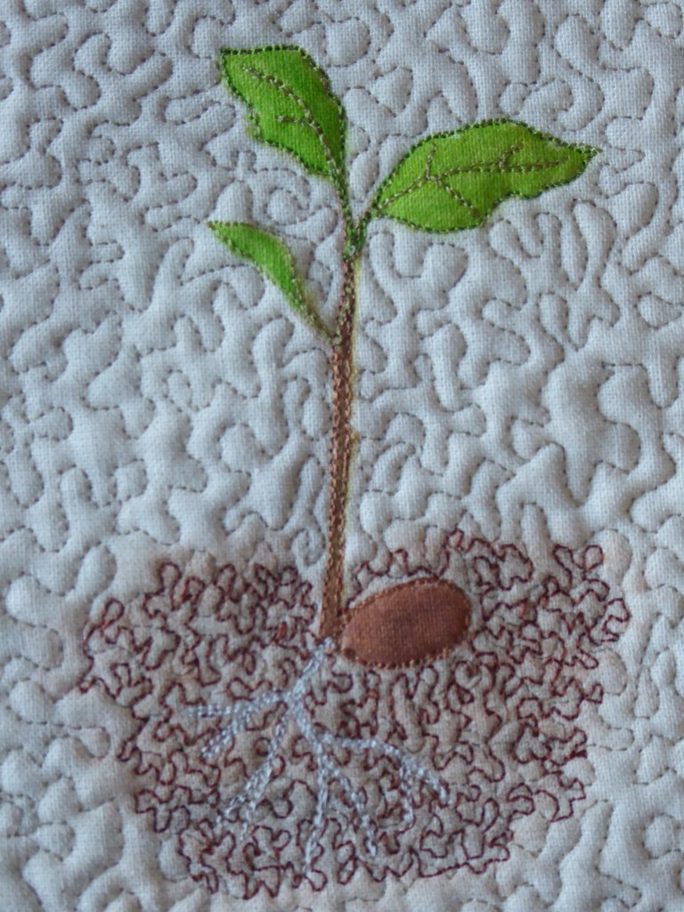 To complete my series and to show the cycle of life and death in Nature, I have included a small oak seedling growing from an acorn and obtaining nutrients from a pile of decayed leaves. This links back to the oak tree that was the subject of my first Nature quilt.