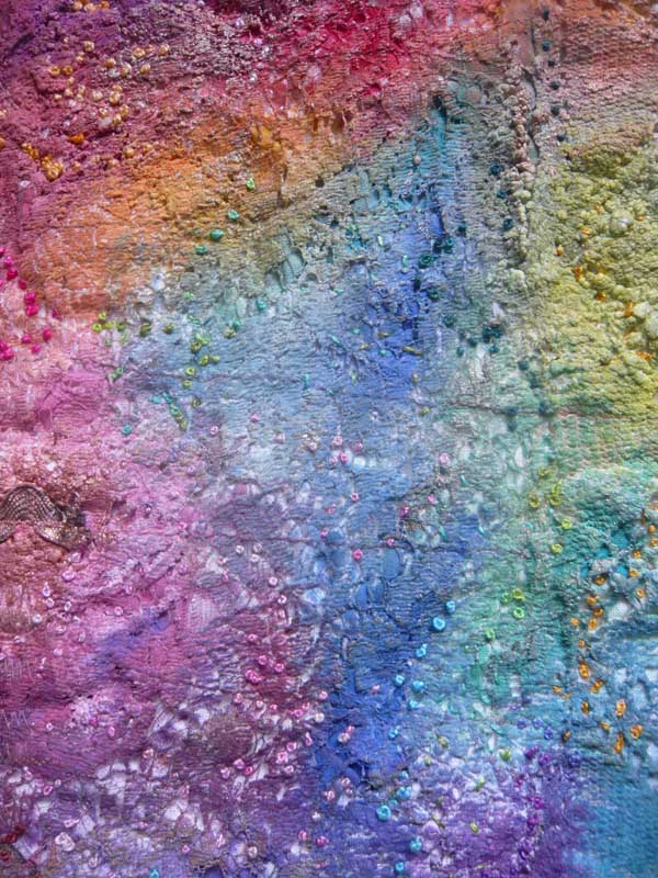 The top layer is made from lace scraps which are stitched to a backing with heavy machine stitching to give it texture. This is further textured using a expanding medium and acrylic paints. The finished fabric has a rough and hard finish even though it has soft and fine lace at its heart. A heart motif is cut out of this fabric to reveal a layer of fine smooth silk below, to give a textural contrast as well as a ‘quiet’ colour to contrast with the busy colours of the main fabric