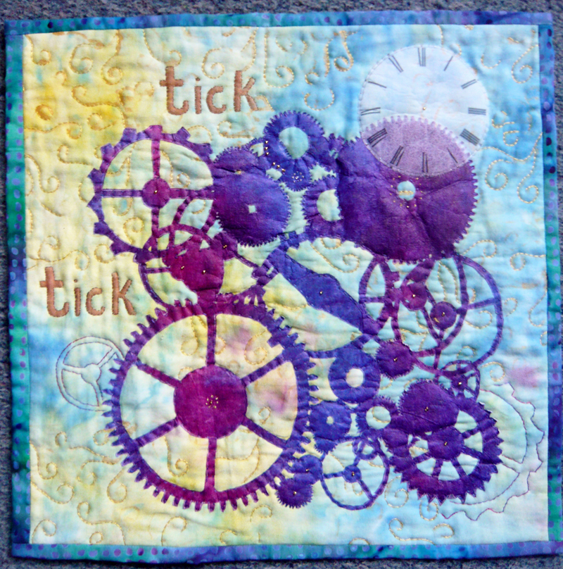 I like this piece very much — and the decision to hand-quilt around the words and shapes…something that takes time and is very much in keeping with the remembering of the way time pieces used to be made. Thank you!