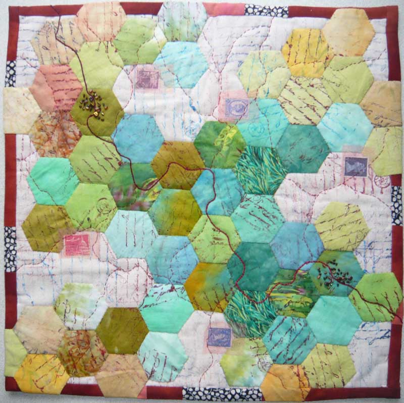 1. An interesting interpretation, Joan. 🙂 I very much like the hexagon “map”, the beading to show the wee towns, and the impression of hand-written letters.