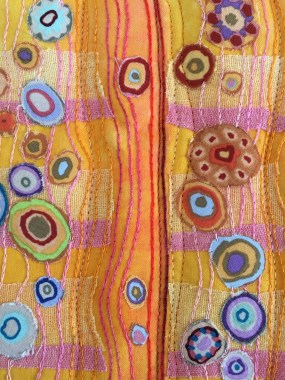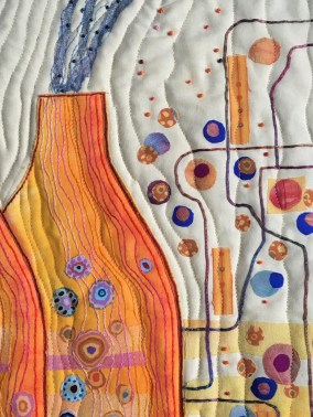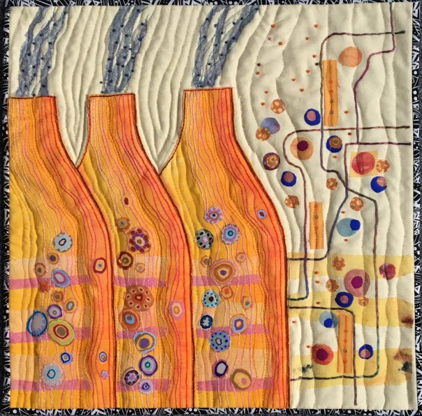 I repeated the shape of the pottery as the main design and used warm colours to represent the heat of the firing process. I followed the shape roughly with lines of chain stitch and added applique coloures shapes within each. I added lines of ribbon to represent the roads around the factory and added more coloured shapes to indicate that pottery is all over the city. I used some machine stitching and beads to complete the quilting. All the lines within the piece are slightly ‘off’ the straight.