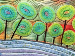 For the background to the trees and vegetation surrounding the lake, I pieced strips of silk sari ribbon together and used tiny seed stitches to attach these to the base.  For the trees I again used hand-dyed polycotton and used inktense pencils to colours bands of green, I then added hand stitched circles to emphasise and add to the bands.