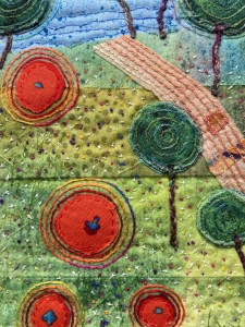 I used a mix of hand-dyed and commercial fabrics to create the strips of ‘grass’ but found them slightly jarring, so overlaid these with some transfer printed sheer fabric, so that the distinctive Hundertwasser stripes remained but in a more muted form. I added straight stitches to give depth to the grass. The trees, the path and the poppies were added as raw-edge applique, and I used chain stitch to give more detail. Once the batting and backing were added I hand stitched the small flowers in the grass to act as the quilting stitches, and waves of stitches in the commercial fabric that I used for the sky.