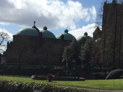 My inspiration for the next in my series is a local church which has always intrigued me because of its unusual architecture, It has four copper domes on the roof which seem to highlight the fact that the rest of the building is very dark and imposing. The church is next to the park, whose bright open spaces emphasise this contrast.