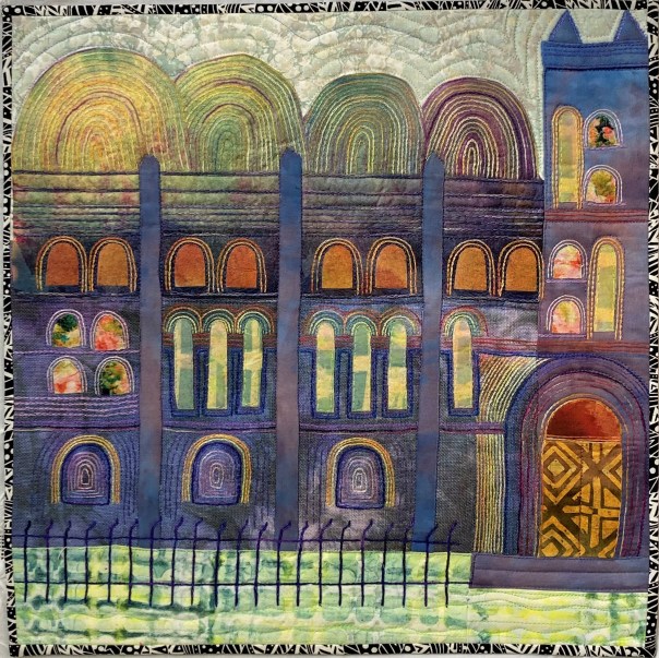 I used a little artistic license in my depiction by changing the shape of the domes slightly and making some of the architectural features more obvious. I also moved the park surrounding nearer to the building. The domes are made from dyed abaca tissue, and the remainder is made from assorted hand dyed fabrics. The windows and door are appliqued to the background, and all the shapes surrounding these features, as well as the other design features, are added by hand using chain stitch. For the quilting I used mainly machine stitch, but followed the lines already created by the chain stitch so that the quilting is mainly invisible.