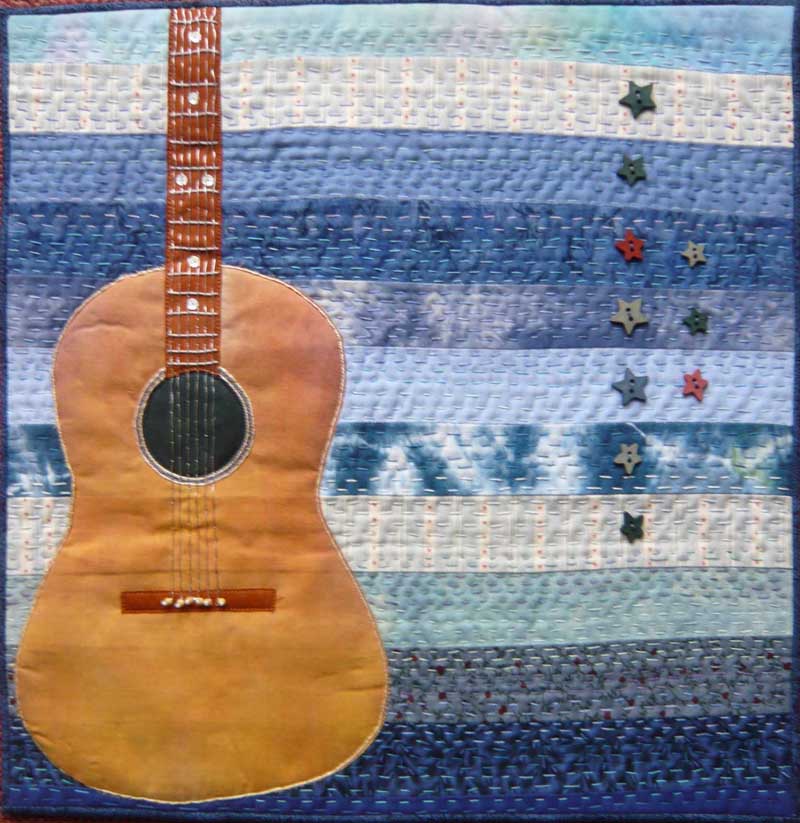 I wanted to set this against a simple background of blue, and since I think of the USA being the roots of this type of music, I wanted to hint at the Stars and Stripes. I therefore pieced strips of blue fabric of varying shades, and using simple running stitches in toning threads to quilt these, and a few star-shaped buttons to complete.