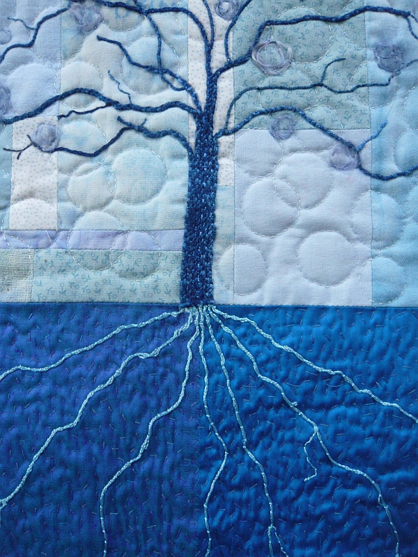 The tree has its dark trunk and branches above ground and set against a pale ‘sky’ made by piecing scraps of fabric of light shades. The trunk and branches are made by plaiting and couching a number of strands of thread of different thicknesses. I have added abstract suggestions of foliage by couching rough circles of mohair wool strands. The darker below ground background is made by piecing strips of silk of darker shades, and the tree roots are couched threads. I have used hand stitched quilting throughout, using circular patterns in the sky and random seeding below ground. Finally I added random beading below ground to suggest water or nutrients in the earth which are feeding the tree.