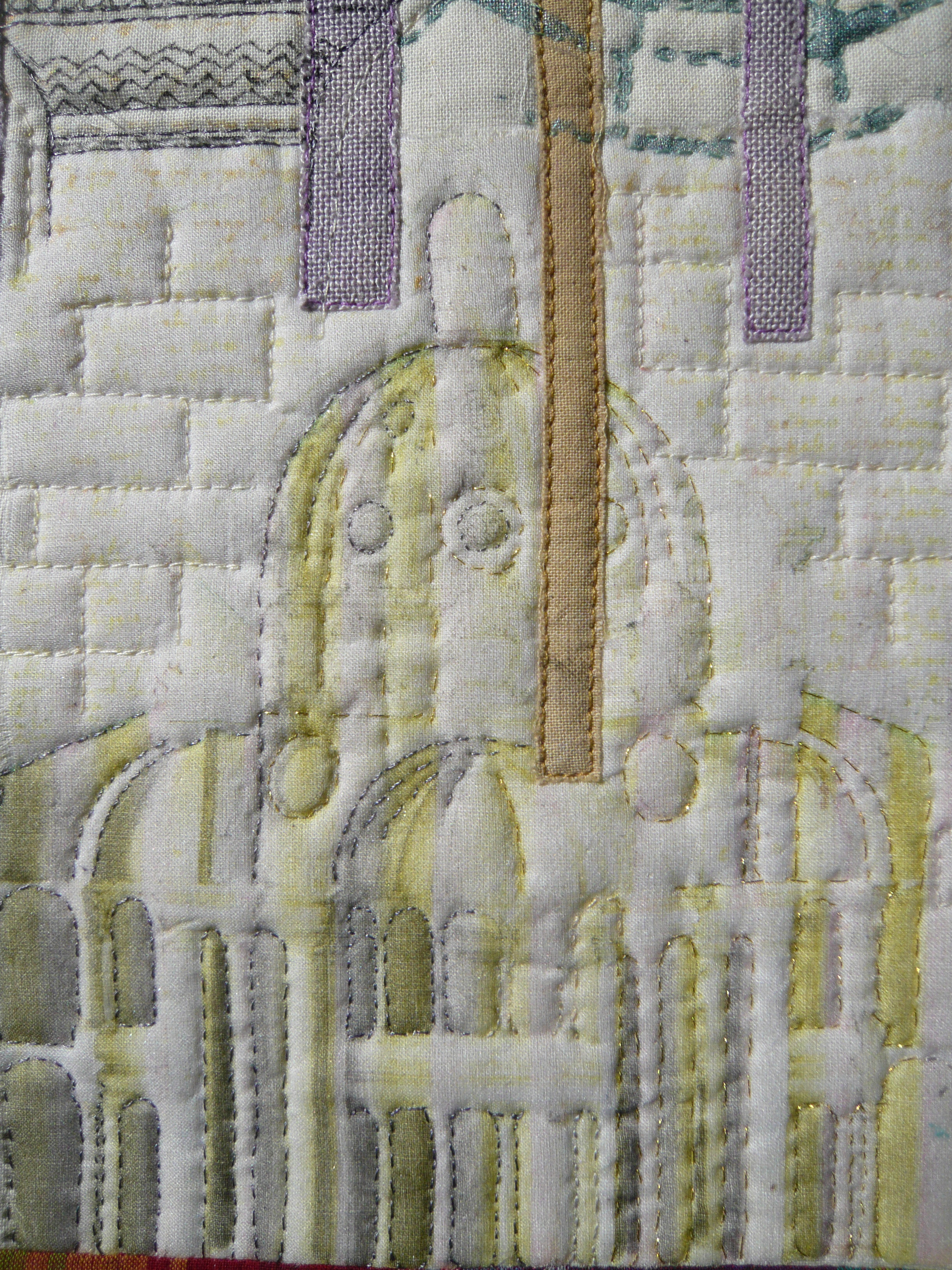 I added machine quilting in a rough brick pattern in the spaces between features, as well as both machine and hand stitched quilting around the main features and patterns. The binding was pieced with coloured insertions and gold stamped words. The colours were included to balance the overall palette of the piece, and worked to represent the possible swatches that an architect could use.