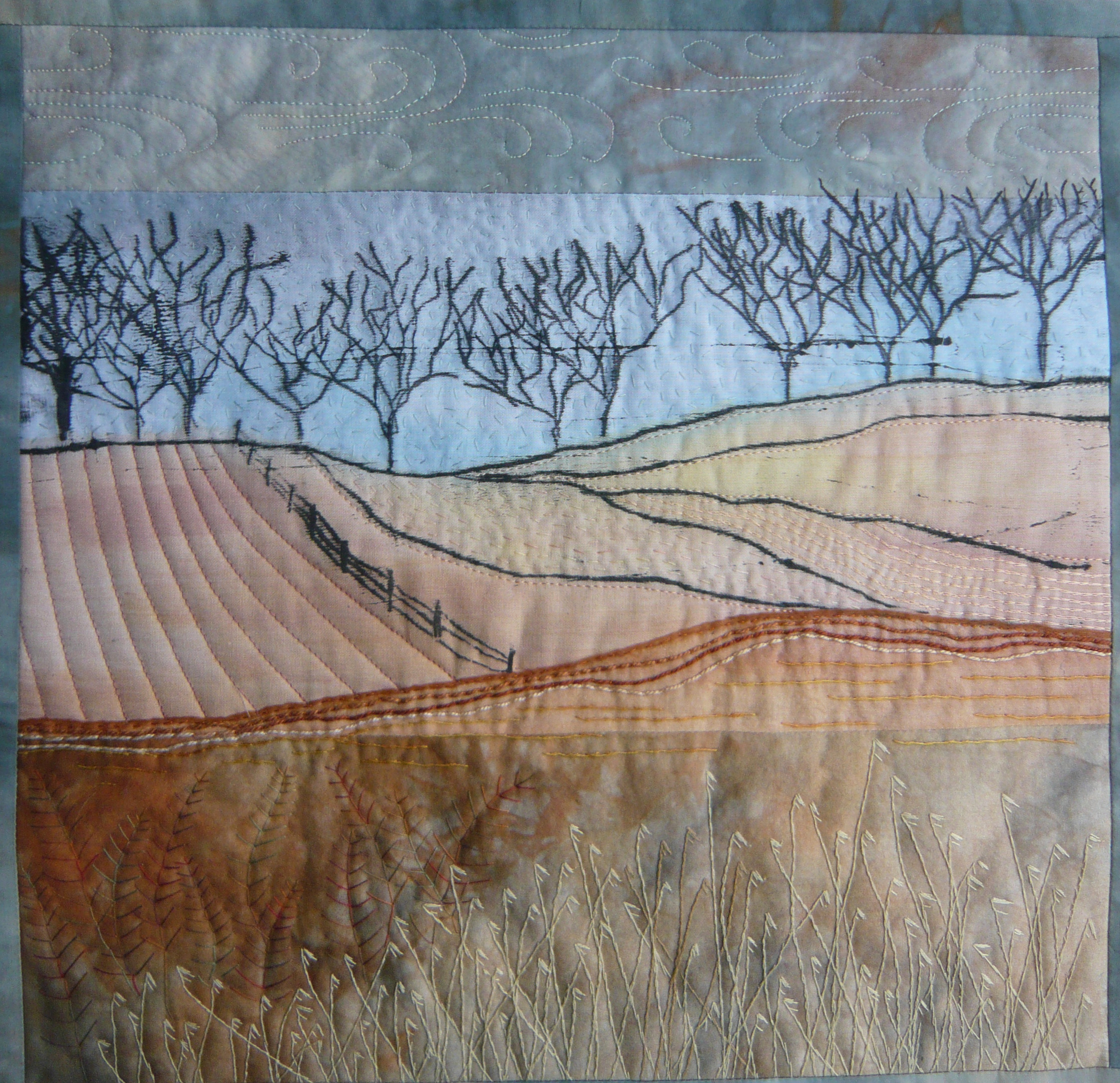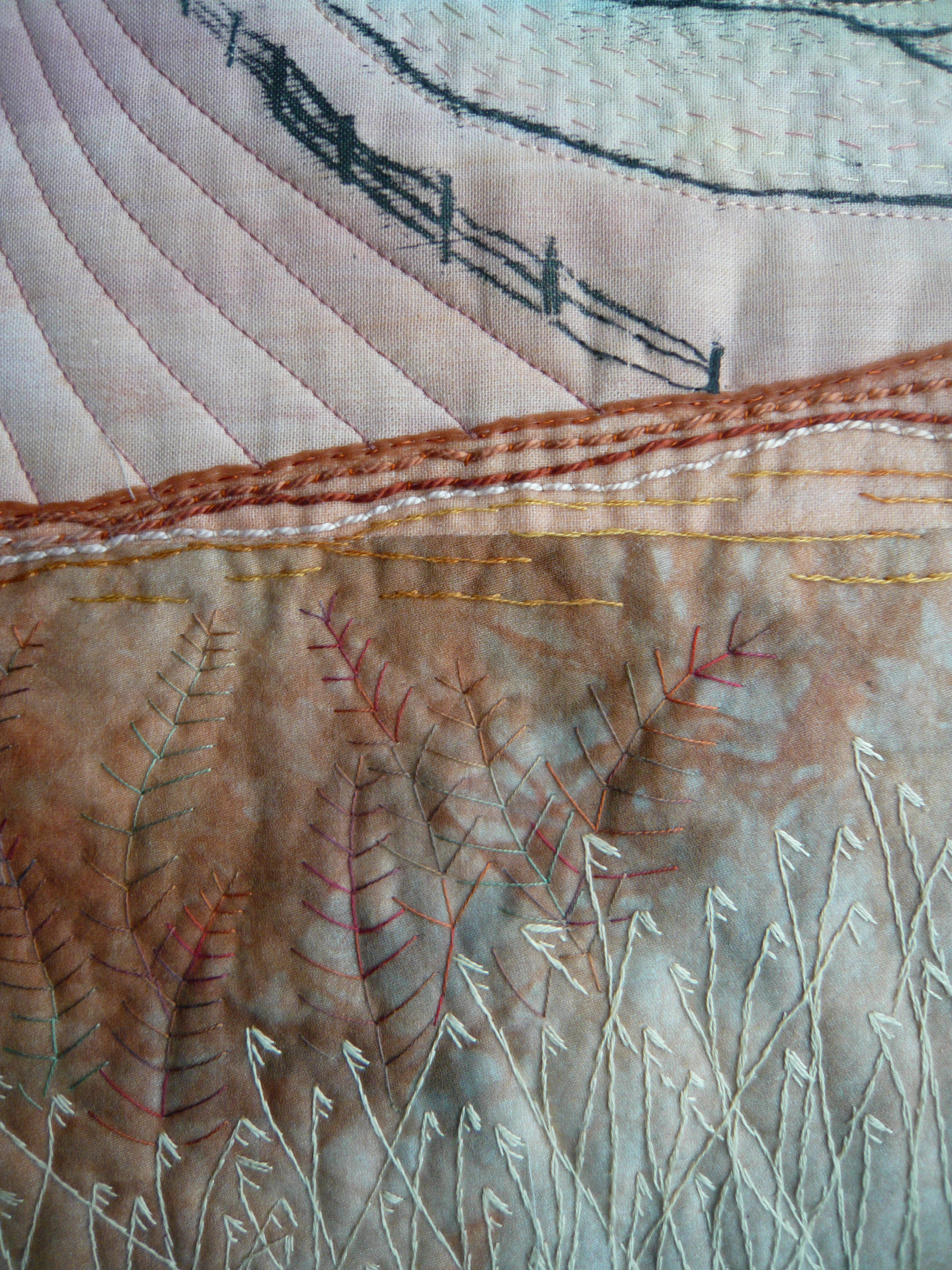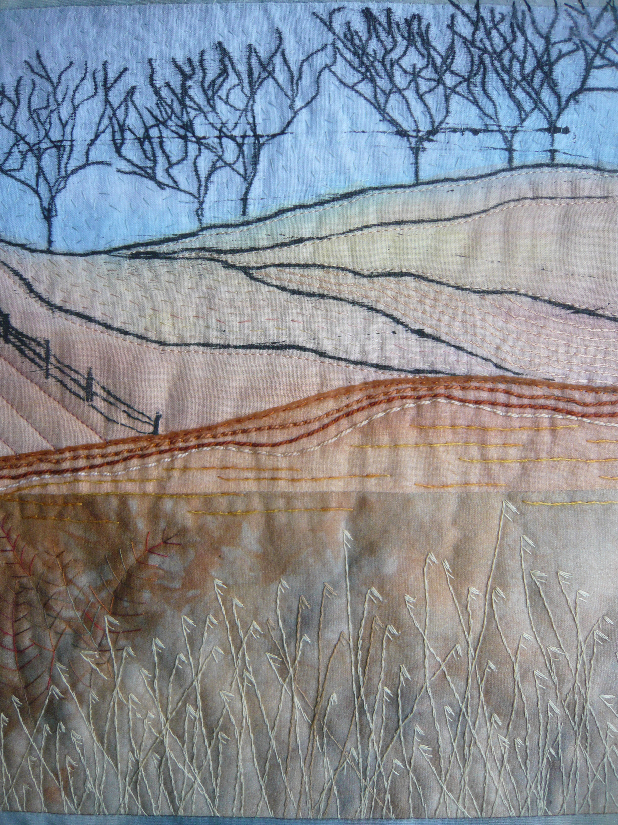 The work is in three sections with the print as the central section. I used a glass printing plate, the width of the finished piece, covered with Thermofax printing ink and drew my design into this on white cotton. I then painted the sky and earth sections of the print with a mixture of fabric paints and inks. There are a few ‘stripes’ of printing ink among the trees, but these do not worry me. The top and bottom thirds of the work are cut from the same piece of variegated commercial fabric. I added a layer of grey/blue chiffon to the top and rust/brown chiffon to the bottom, to give each a richer colour. I added a line of black quilting stitches to the printed ‘contours’ of the fields, then machine quilting for the ploughed field, and the ‘clouds’ in the top section. The grasses and ferns of the foreground, and the remainder of the other elements were worked by hand.