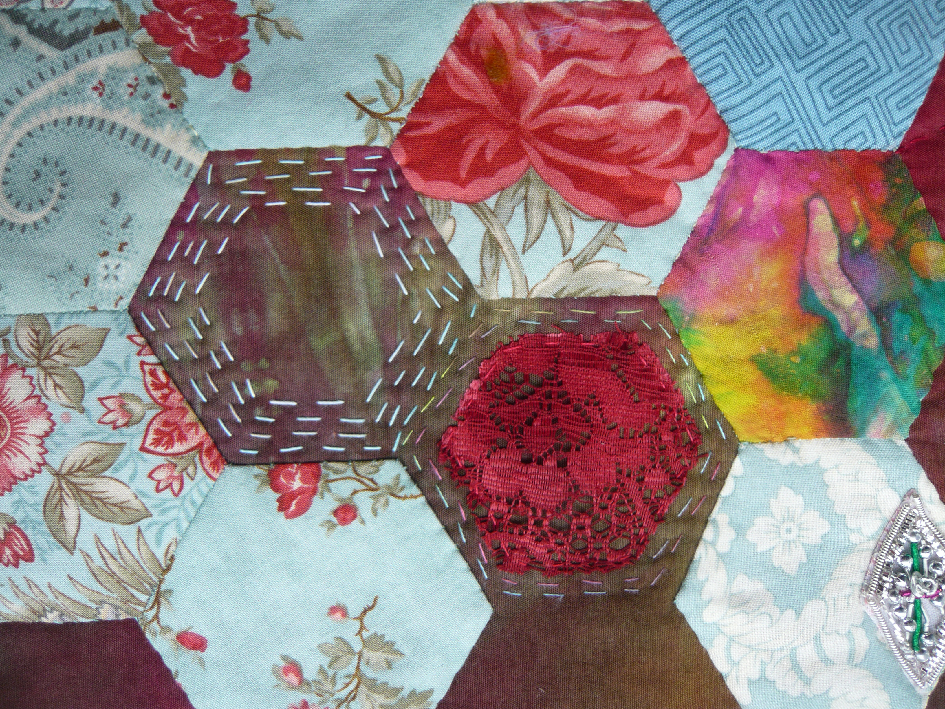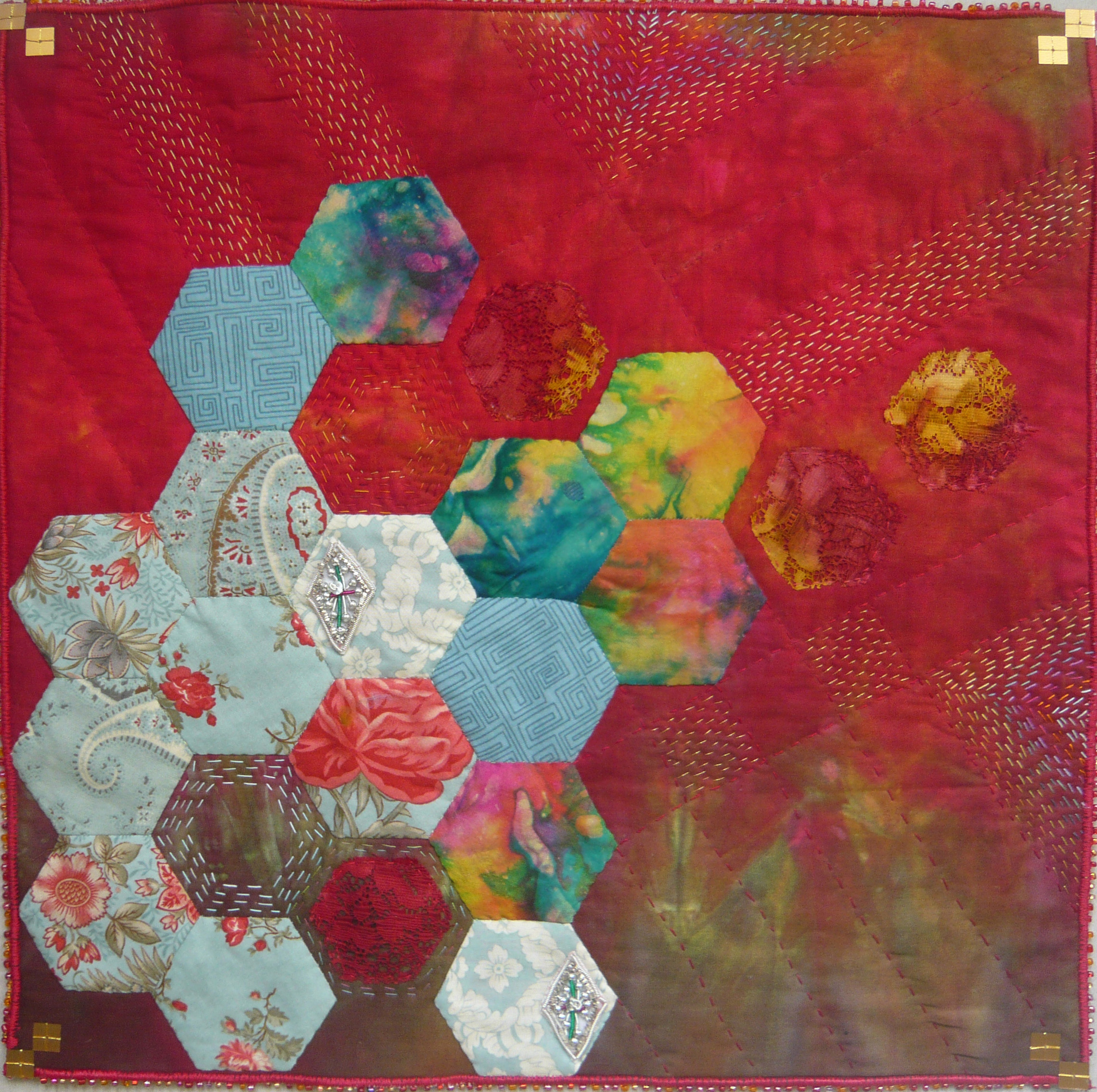 I thought about this subject long and hard, and what I decided was to try and combine the ‘differences’ that struck me about the theme. When I think about East, I think about warm, rich colours, silk, and shiny embellishments. When I think about West, I think about cool, delicate colours, cotton, straight lines and modest embellishments. Of course English paper piecing springs to my mind, because this is one of my favourite techniques. I used a rich red dyed cotton fabric for the background, and appliqued onto that a section of English pieced hexagons which used printed commercial fabrics and hand-dyed silk and lace. By doing this I was intending to mix the fabrics that remind me of both East and West. I then added Kantha stitching to the piece in the open areas. My intention here was to bring together the quilting techniques of East and West. Finally I added some sparkly ‘eastern’ embellishments and some subdued square ‘western’ embellishments, and I finished the piece edging the quilt with a row beads.