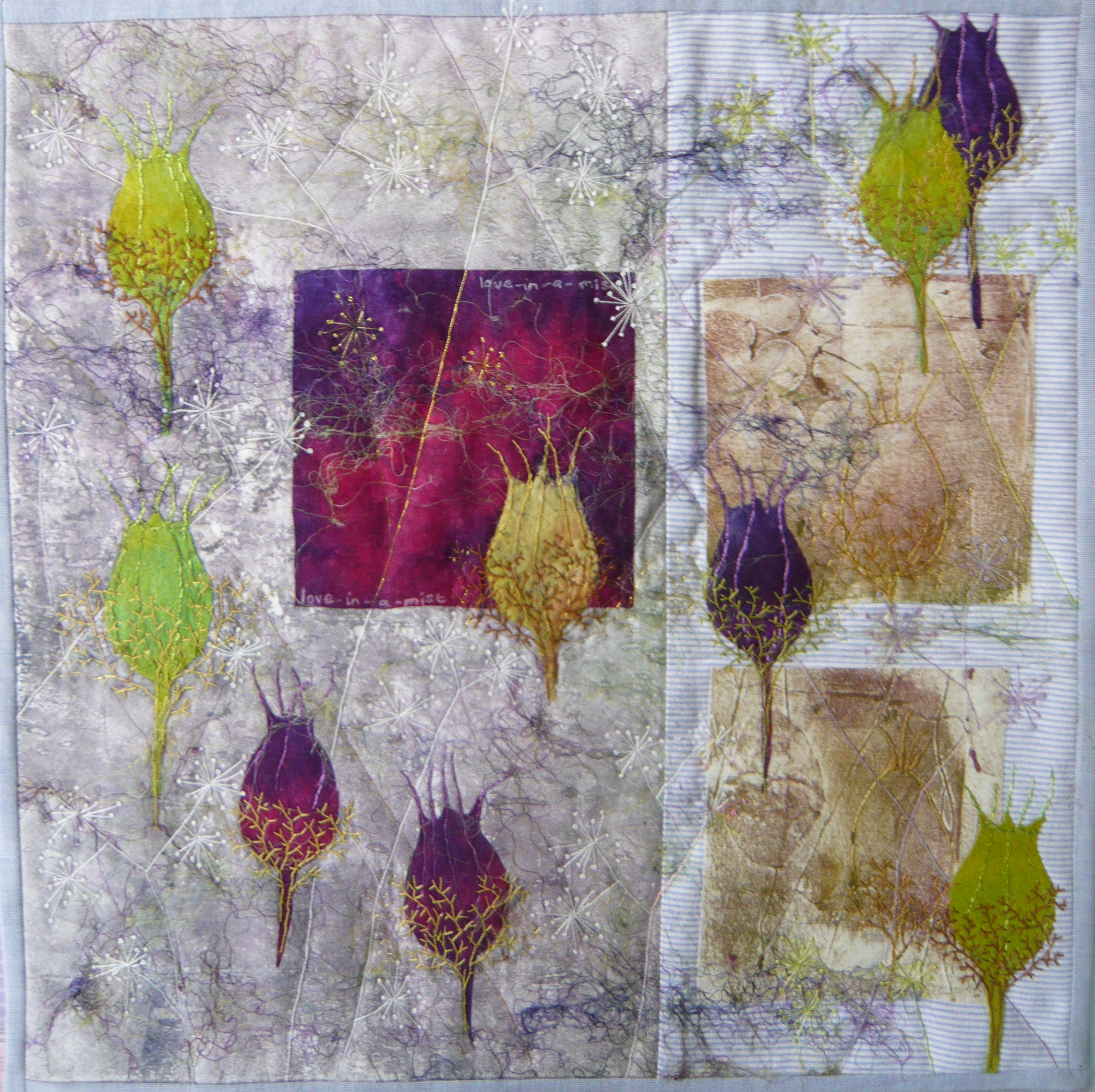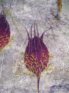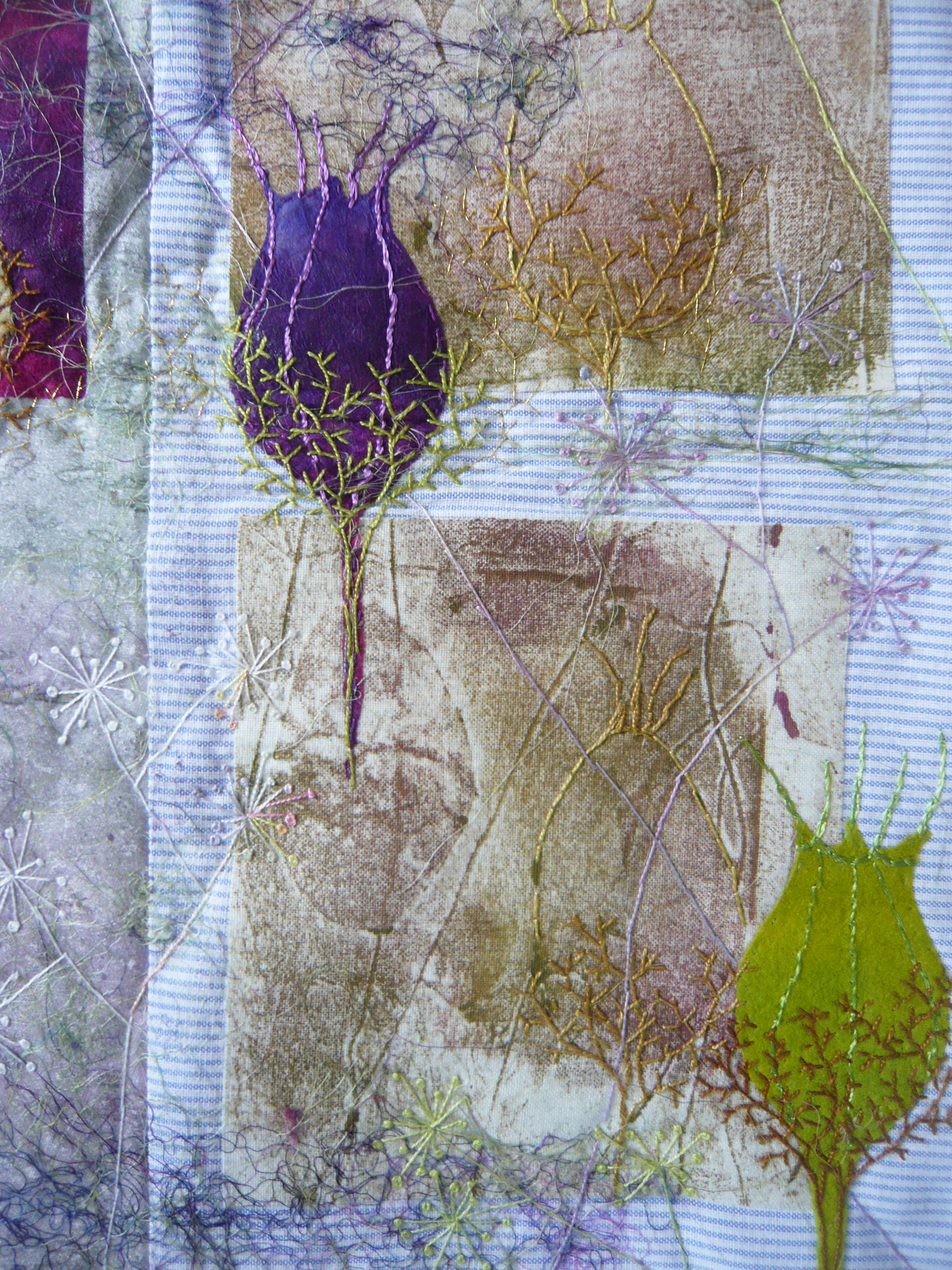 With the different surface techniques and embroidery you used, you created a misty field feeling for the delicate nigella. Just lovely.