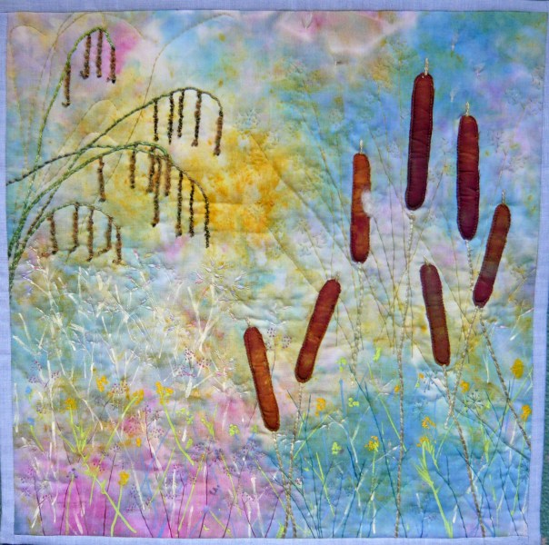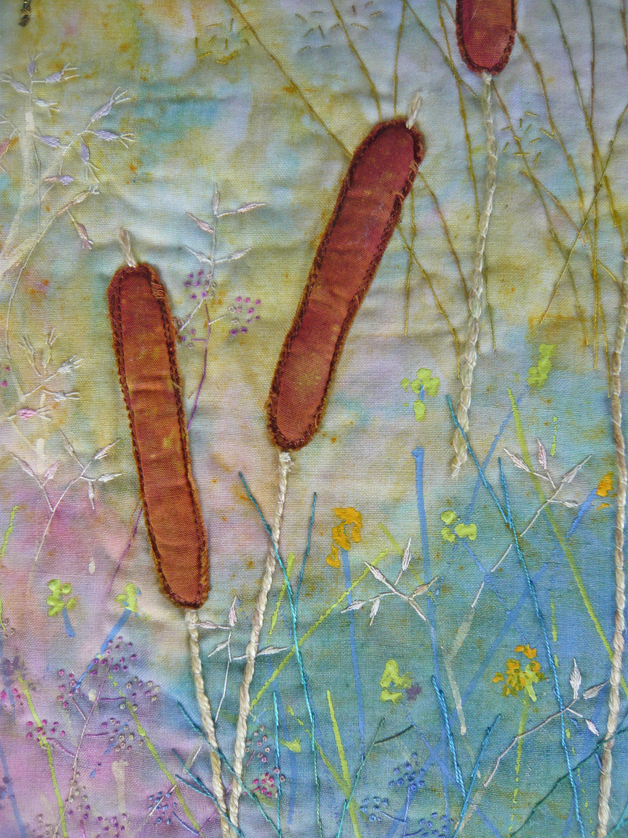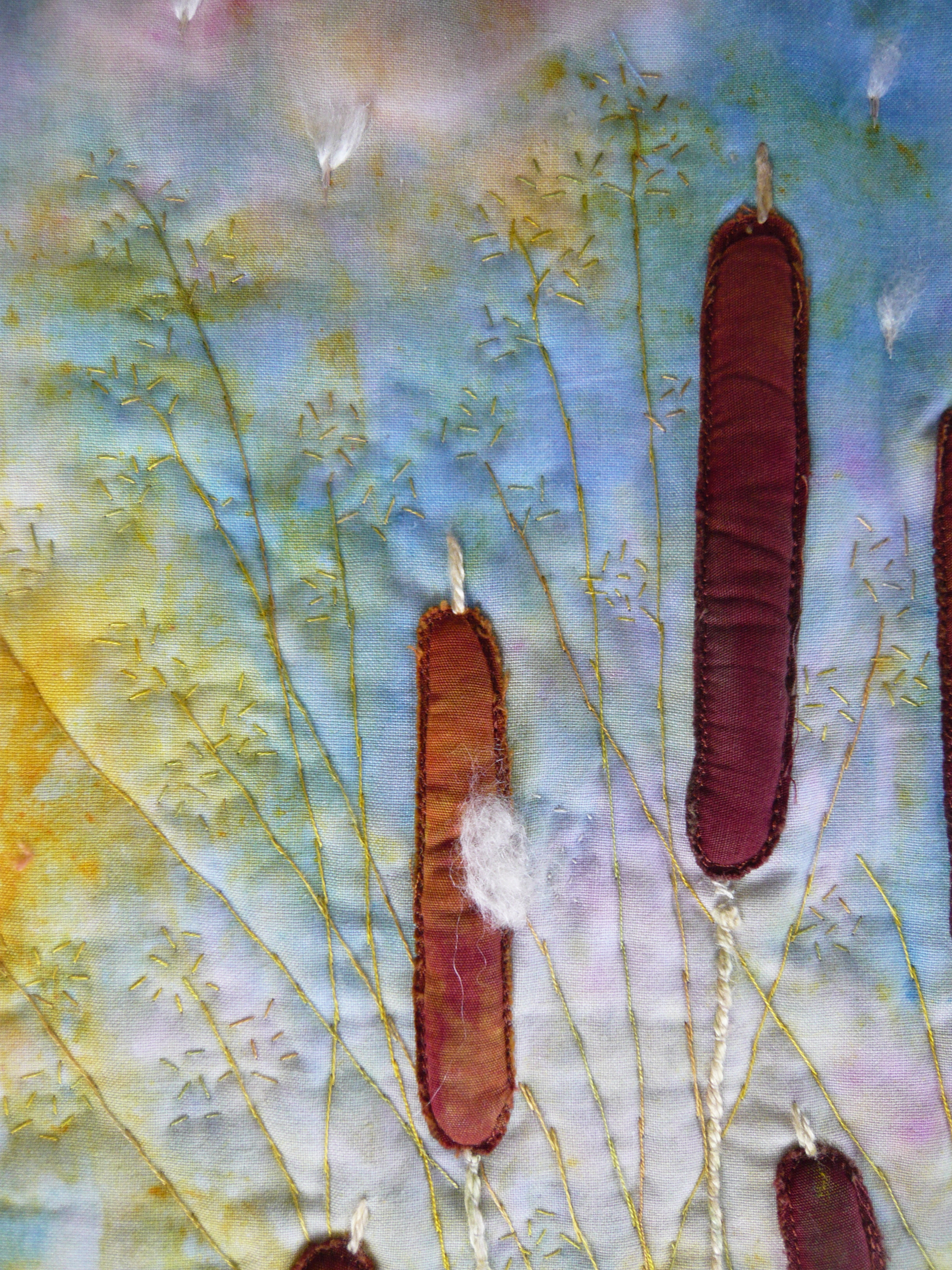 I used microwave dyed polycotton for the background in colours that remind me of summer, and I added further background details with acrylic and texture paints. I added the reedmace heads with trapunto quilting to create its distinctive shape.  The seeds of reedmace (also known as bull-rush) are fluffy and were once used to stuff pillows and mattresses, so I wanted to include a reference to this, to emphasise that the form we see is the seed-head. I have used wool fleece fibres to show the seeds bursting from the seedhead, and floating above the plants. I couched down the threads which formed the hanging seed-heads of the sedge. The grasses and the background details were ‘drawn’ by stitching with various thread. All stitching in this piece has been worked by hand. Finally I added a stalk of sweet cicely (which is included in all my pieces for this series) – you challenge is to find it in this piece!