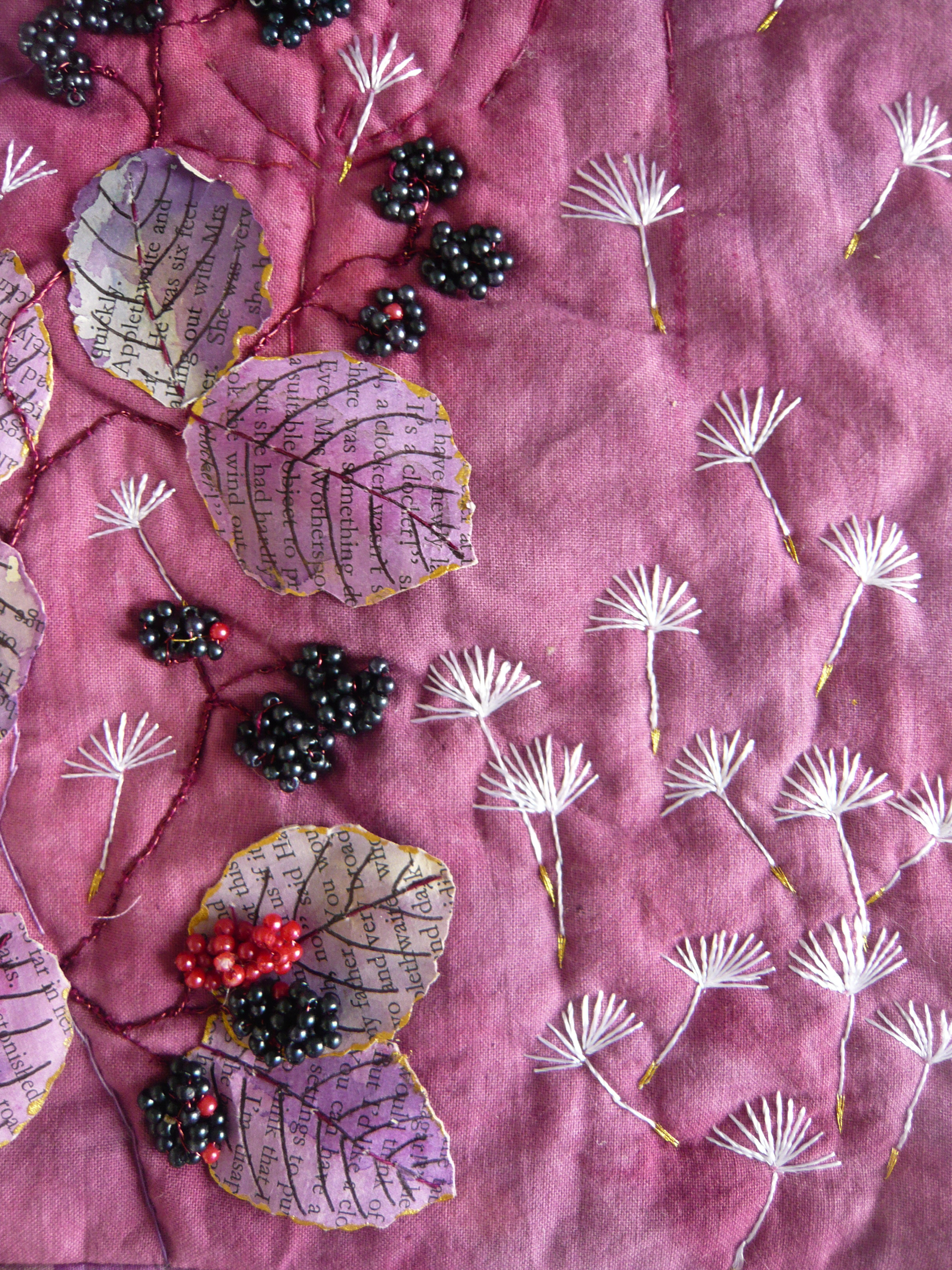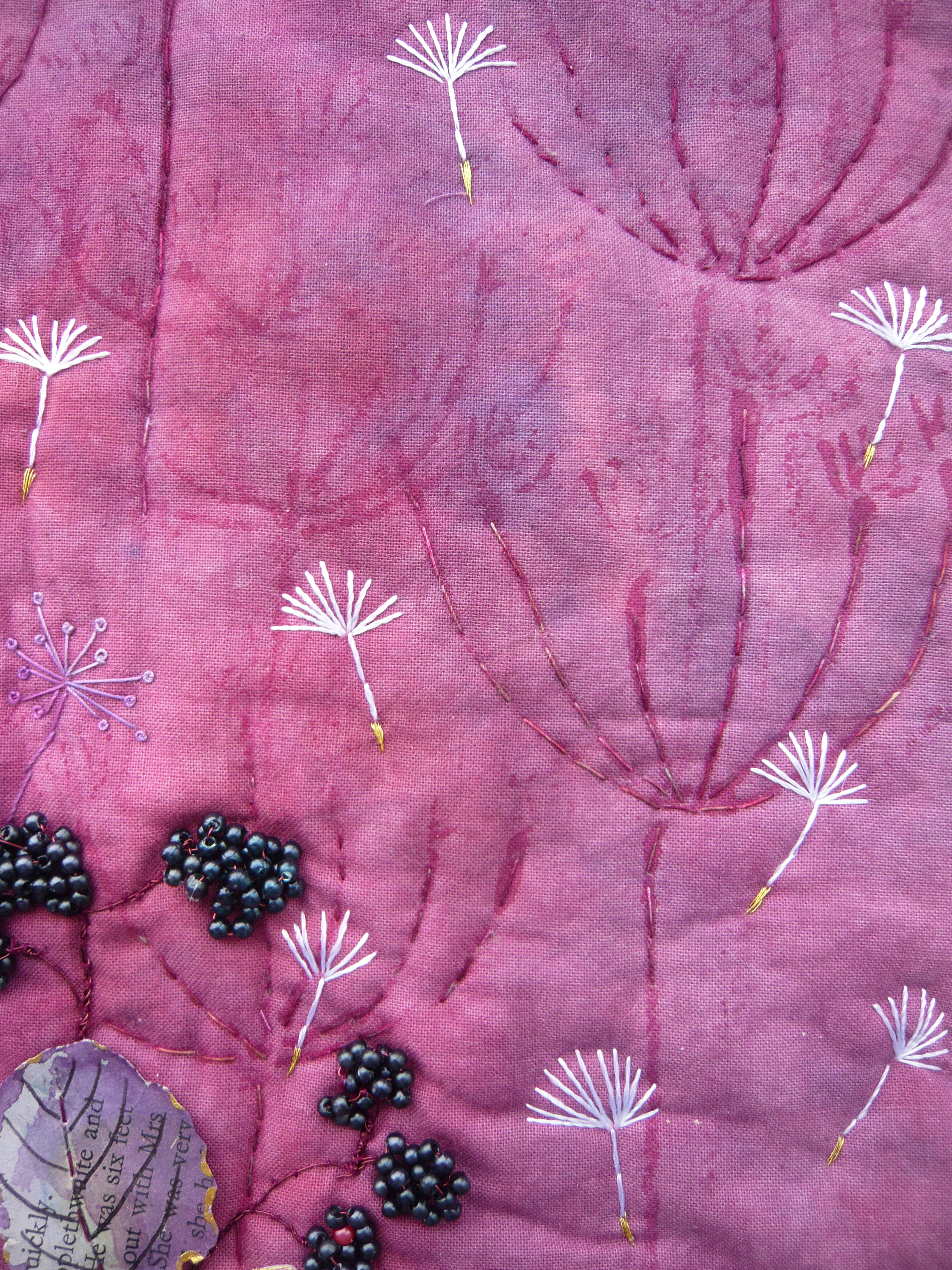 I opted to use Honesty fronds from my first piece, but this time made silk paper for the majority of the seed heads, with a few transfer dyed sheer fabric additions. I made another string block, and stamped cow parsley seed heads in the background. For the blackberry patch I dyed and painted paper shapes for the leaves, created blackberries using beads and wire, and used the same wire for the stems. I used dandelion seeds scattered through the piece, to give the impression of having just blown away from a seed head. Finally I added some fronds of my ever-present sweet cicely heads in the background.
