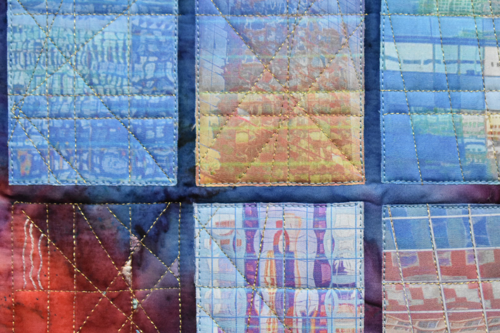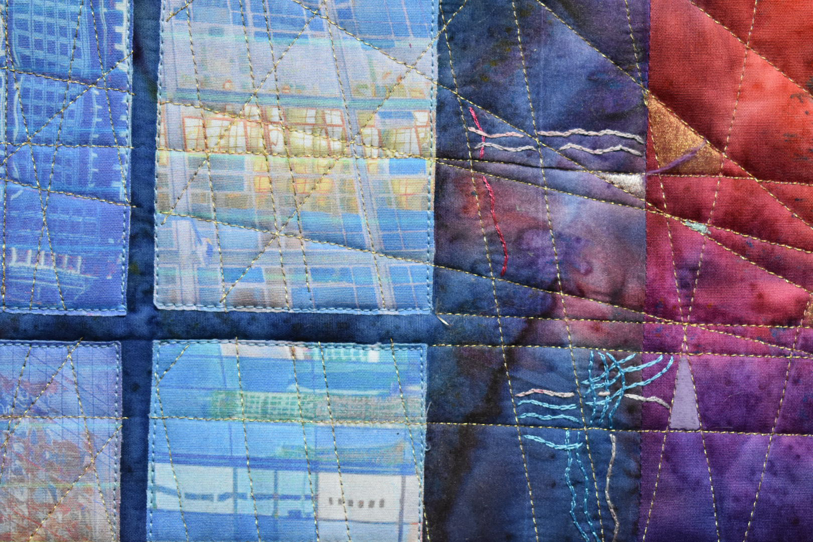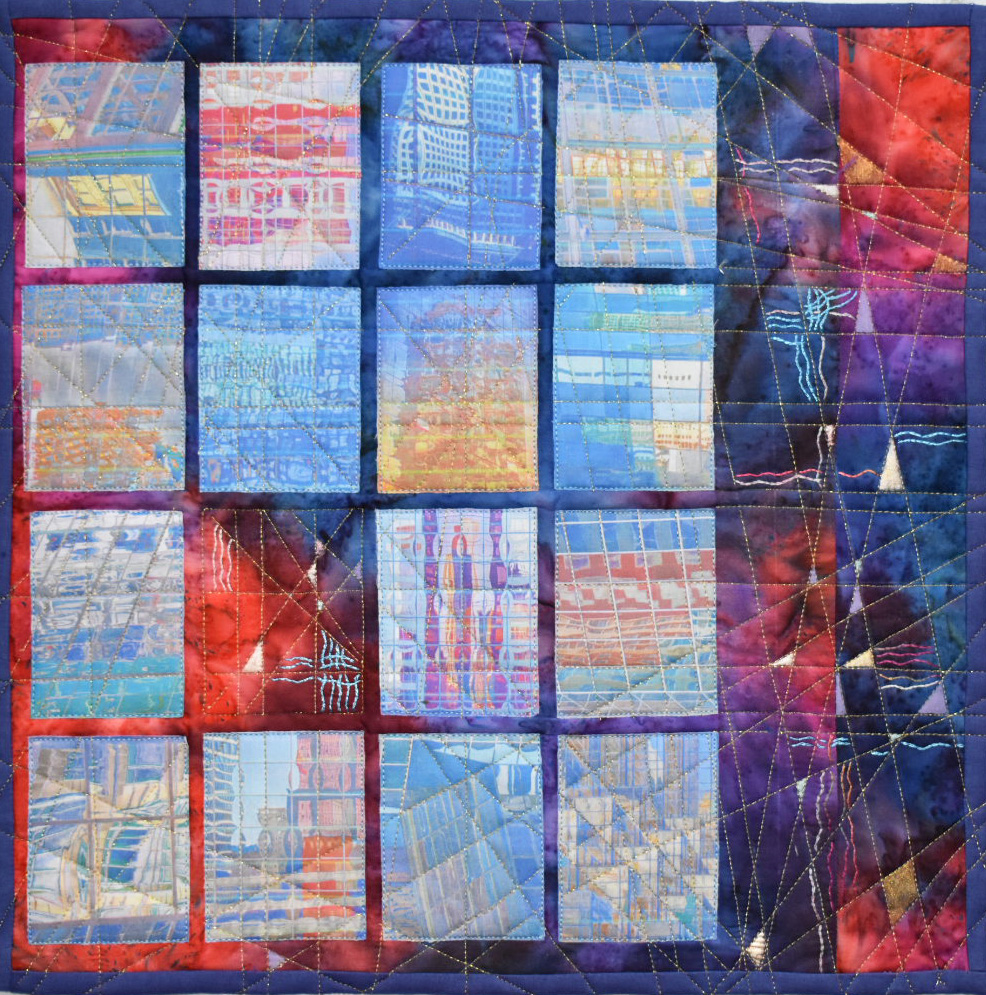 I started by finding, manipulating and printing pictures of building reflections, on transfer fabric. These were cut into window shapes and added to the commercial fabric that I used for the background. I didn’t want the windows to fill the piece, because a city scape contains gaps and open spaces between and among the buildings. I therefore left one ‘window’ open, and positioned the ‘building’ so that there is open space to one side. To emphasise the geometric nature of city architecture, I decided to use straight line machine quilting, and I tried to pick up and extend some of the lines within the pictures. I used a gold thread for the quilting to depict the glints and shafts of light that come between buildings and that reflect off the shiny surfaces.