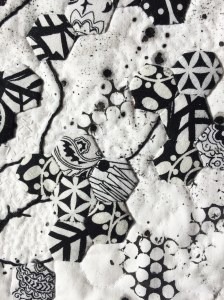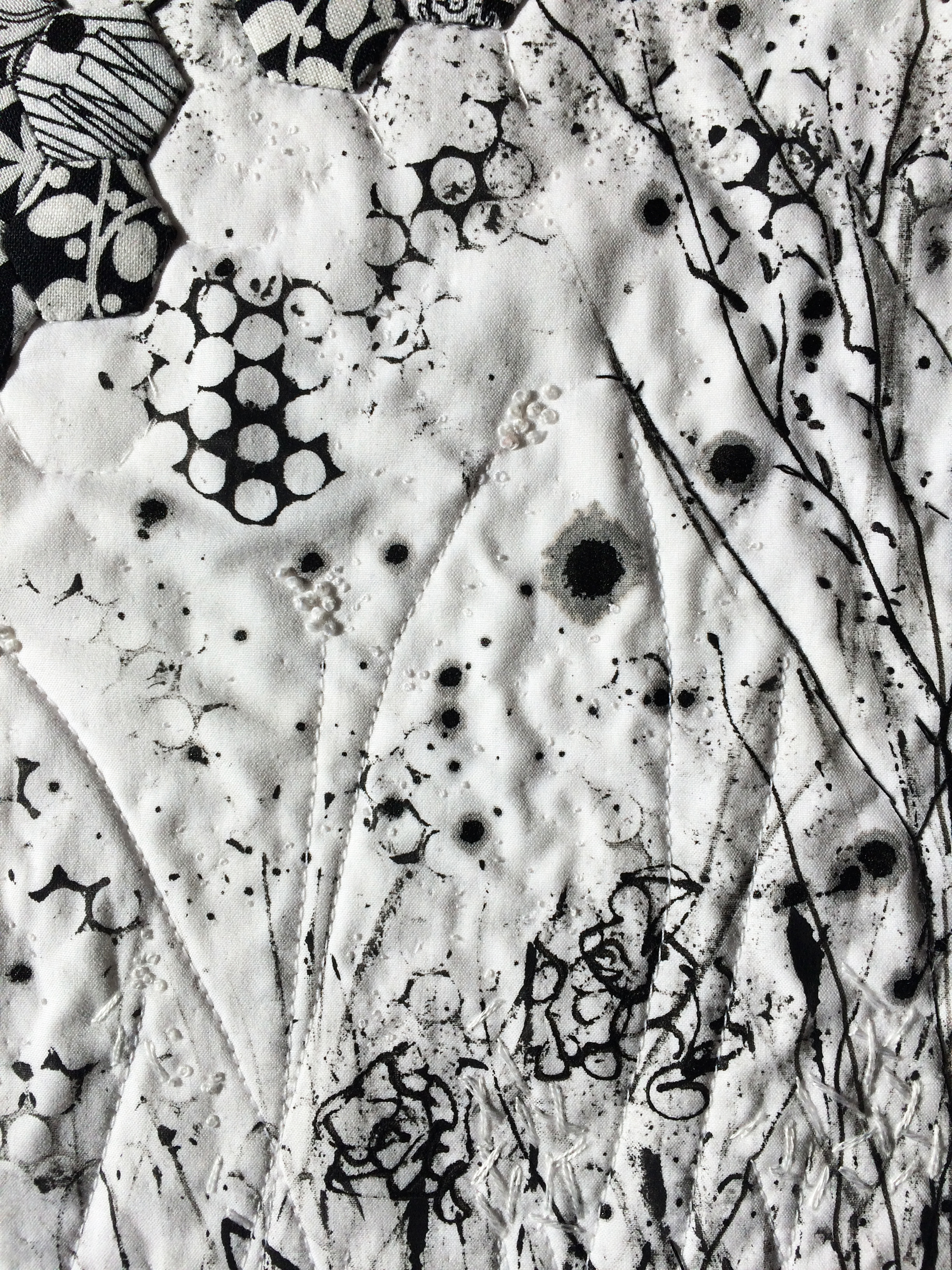 I found the black and white challenge surprisingly freeing, because most of the decisions about colour were removed, and I could focus on the design. I knew that I wanted the background to be white and that I wanted to make it interesting with unusual mark-making, so I set to it with abandon! I made a stamp using several cardboard tubes (the inside of loo rolls!) fastened together with an elastic band, and printed the grassy area using black acrylic paint. I used the same paint but with broccoli florets to the speckled areas around the top of the bushes. I printed with sequin waste dipped in black acrylic paint to form irregular patches of hexagons. I used black Gutta to draw in the branches and clumps of bushes, and finally I splattered the piece with black writing ink.