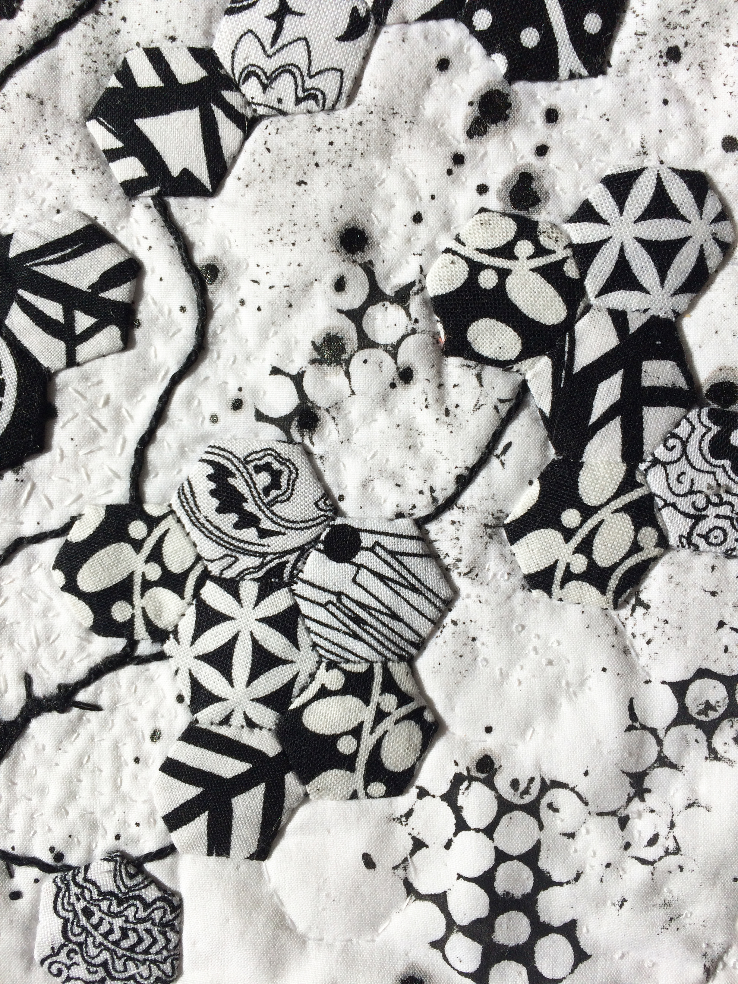 Black and white challenge, unusual mark making, groups of mini-hexagons, paper pieced hexagons, hand quilting,  black and white hand stitch, explore design