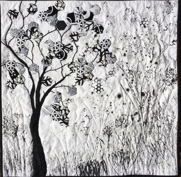 To finish I used mainly hand quilting, with the exception of a few strands of ‘grass’ that were created with straight lines of white machine stitching. My quilting consists of regular white seed stitches among and around the tree branches, with minute black and white hand stitches among the speckled areas above and among the bushes. I added a few French knots, chain stitches, and running stitches among the undergrowth and bushes. I also included a few ’empty hexagon’ shapes at the edges of the leaf shapes, using white running stitches. I did not want the quilting to be too obvious because I think the background is busy enough without further ‘interruption’. I used a plain black fabric to produce a very narrow edge binding.