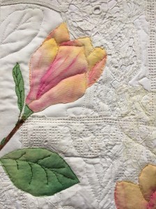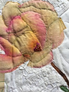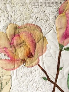 I created a mainly plain white background using vintage lace tray cloths and coasters, and added pages from an old book. For the blossoms I used my own dyed fine cotton, that I coloured with Inktense pencil. I added the petal shapes with contrast machine stitching. The leaves, stems and flowers were all bonded to the background and machine stitching used to secure the outlines. I used machine stitching in white and cream, to quilt the piece, and used leaf and blossom shapes for the quilting pattern. I added a few beads and French knots to detail the inside of the open blossom.