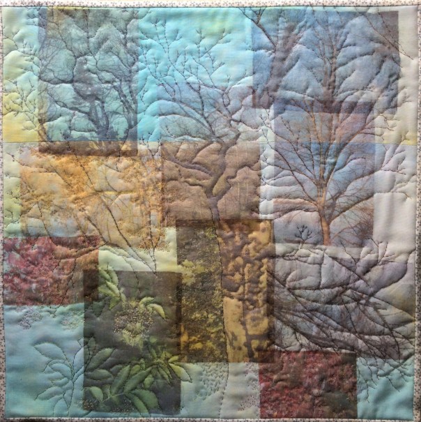 I love trees in all their shapes, formations, lines, colours and textures. I find them to be a never-ending source of inspiration and for that reason I have many photos that I have taken over the years. I selected a few of those and isolated parts of the tree rather than replicate the whole structure – some show only branches, some show leaves and fruits, and some show the trunk. I printed my manipulated photos onto Extravorganza, then bonded these to a hand-dyed background which replicates sky colours.