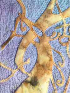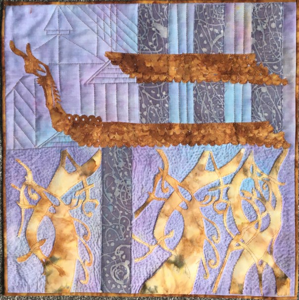 I used a hand dyed polycotton as a base and added columns of wax-resist dyed calicomto represent the decorated columns. I cut the animalistic designs from a batik and used raw-edged applique to attach it. I then used a kantha-type hand quilting all around the animal design to make it stand out as if it has been carved. I cut a darker batik into lines of overlapping ‘scales’ of two roof sections, and the same fabric for the ‘dragon’. I hand-stitched these again as raw-edge applique. I added more columns, rafter and roof shapes with machine quilting. Finally the quilt is bound with the darker wood colour.