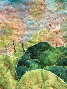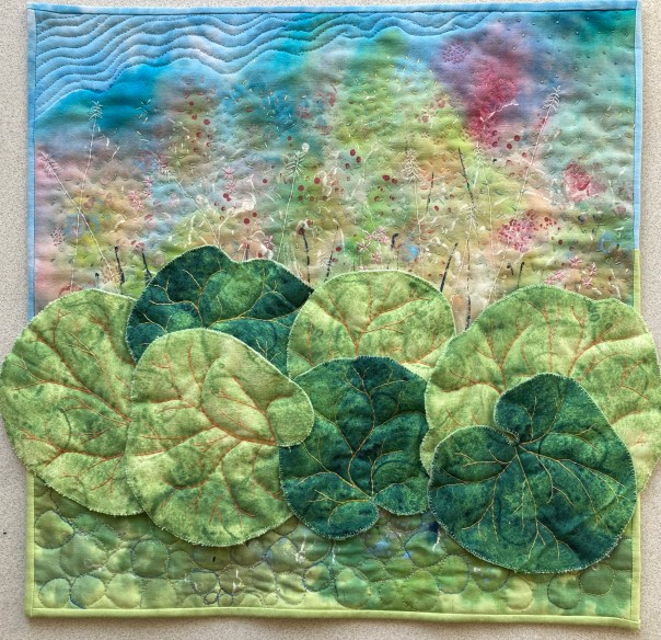 I used hand dyed fabric as the background, but I wasn’t quite happy with the colours, so I painted and printed in a random fashion until I was happy that it gave me the abstract notion of wild flowers that I wanted. I added more abstract details by stitching fine stalks and random chain stitches to hint at flowers and leaves in the background. I used machine quilting at the bottom to suggest the rippled reflections in the water (where Butterbur loves to grow), and at the the top to define the sky.