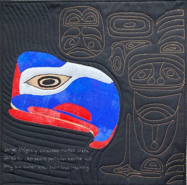 I chose a plain black background to highlight the simple line designs of the wood carving designs and striking plain colours of the mask. I used raw edge appliqué to add the mask and a mixture of hand and machine stitching to add the carving designs. Further machine quilting in black echoes the shape of the mask and the movement I imagine it making when worn by its creator. I used hadn’t stitching to create the words, as I wanted them to be slightly roughened (as if they were carved from wood).
