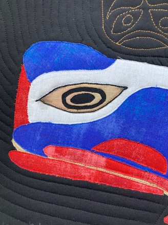 Very striking quilt. The dark background makes the mask stand out and is perfect for showcasing the designs fore the wood carvings. Lovely stitching and echo quilting. Beautiful!