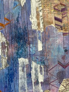 The abstract nature of your quilt is stunning, the use of color is perfect. The old, weathered and torn newsbills add a touch of realism overall. Good job.