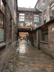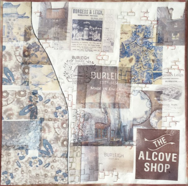 For this piece I have used images of art work in and around the factory. There are graffiti-like painted sections of the canal wall at the back of the pottery which depict the type of patterns used in the ware, and I have always loved their bold patterns. In addition the little tearoom at the pottery has one wall covered with artwork taken from the old-fashioned willow pattern that was so popular once. In addition, I used images of the little alleyways and alcoves amongst the Victorian factory buildings, with their cobbled surfaces and little nooks and alcoves in unexpected places.