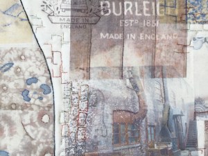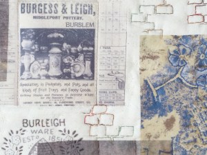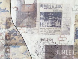As with my other pieces, I have used photo-transfer techniques, and embellished them with hand stitching to highlight main areas of design and act as quilting stitches. For the stitching I have repeated the cobble and brick design, the outline of the bottle oven, and added some stylised flower patterns as depicted in the willow pattern.