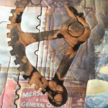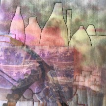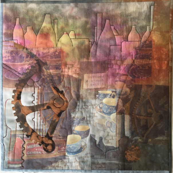 I created a stencil to depict the skyline and used that to stamp the smoky sky. I coloured some sheer fabric with transfer paint and applied this over the top of the stencil to give it a more faded and ‘remembered’ feel. On the right-hand side of the piece I used the bottle oven shape that I have used throughout this series, to emphasise the chimney motif. I used shapes from the hoisting machinery to form the cogs and the outlines, and used the same shapes in photo images which I added. I also added photo transfers of cups, canal boats and other factory images. Finally I included some cobble/brick quilting in places.