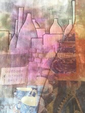 Continuing my pottery series, this time I chose to depict the surrounding areas and the sights that were once there and now only remain in hints. The canals would have brought clay to the factory and were used to ship the finished ware, and the machinery depicted was used to hoist the cargo on and off the barges. The skyline was once dominated by chimneys, including the iconic bottle ovens (which are in fact specialised chimneys), and of course the attendant smoke. Nowadays the potteries and bottle ovens are gone. Middleport pottery is still has one bottle oven and the hoisting machinery still remains, although now rusting and disused.