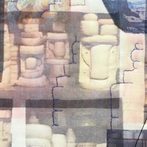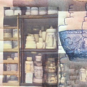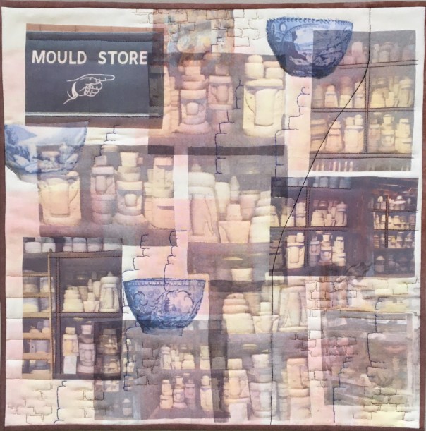 I used a transfer printed cotton as the background, but since the colours came out too bright for my design, I used the reverse of the fabric. As with the rest of the series, I have used a collage of transfer prints of my own photos. I hand quilted around the mould shapes throughout and copied the outline shapes of the stacks of moulds to add further hand-stitched quilting lines. Because of the historic feel of the store, I included prints of some bowls which have older designs. I added the shape of the bottle oven on the right of the piece, and some brickwork shapes, to continue with the ongoing theme of the series.