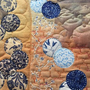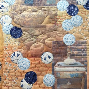 The images are photo-transferred and bonded to hand-dyed fabric. Some of the plates are created from paper napkins sold at the factory which show the actual patterns. These are bonded to the background, along with other fabric plates created from commercial fabrics which resemble the pottery patterns. I have further bonded a chiffon shape that represents a bottle-oven (in which pottery was once fired), on the left hand side. I have used hand-stitching for the cobble-stone shapes and around the pots and plates, to act as quilting, and have added a hand-stitched representation of the flower pattern. Part of the ‘Middleport Pottery’ company sign built in to the factory has been used to include the letter ‘P’